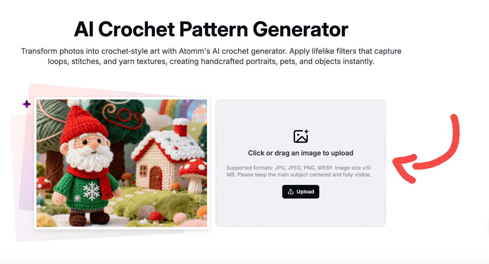 Open the Atomm Crochet Pattern Generator and upload your image in JPG or PNG format. Make sure the file isn’t excessively large—very high-resolution images may produce overly detailed grids that are harder to follow as crochet patterns.