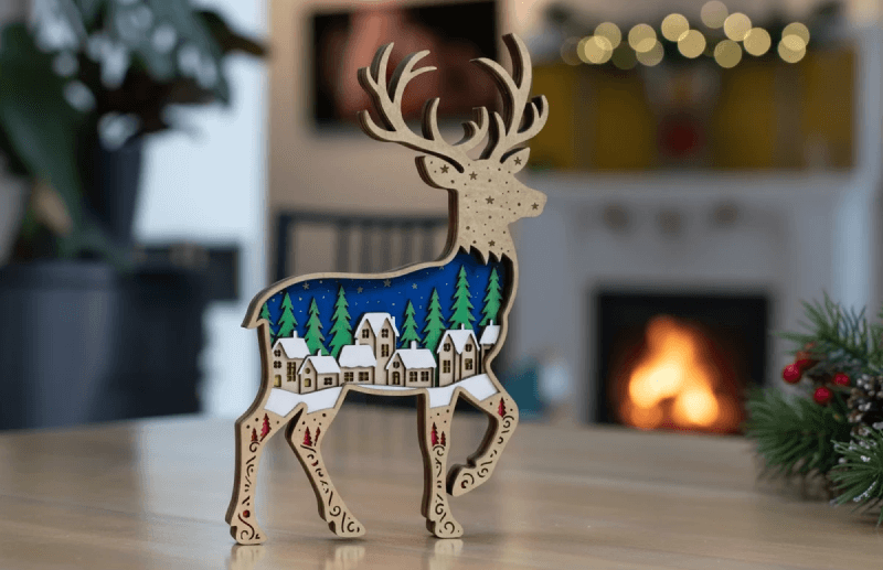 This isn’t just a reindeer, and it’s a window into a winter’s night. Laser-cut with precision and painted with care, this wooden ornament features a miniature village nestled inside the reindeer’s body: snow-covered rooftops, pine trees, and a starry sky that glows with holiday magic. Every swirl and pattern on its legs adds depth and charm, making it a true centerpiece for mantel displays or festive shelves. It’s the kind of ornament that invites you to pause, imagine, and feel the warmth of home. Discover this beautiful multi-layer Christmas reindeer for laser cutting, featuring a charming snowy village nestled inside.