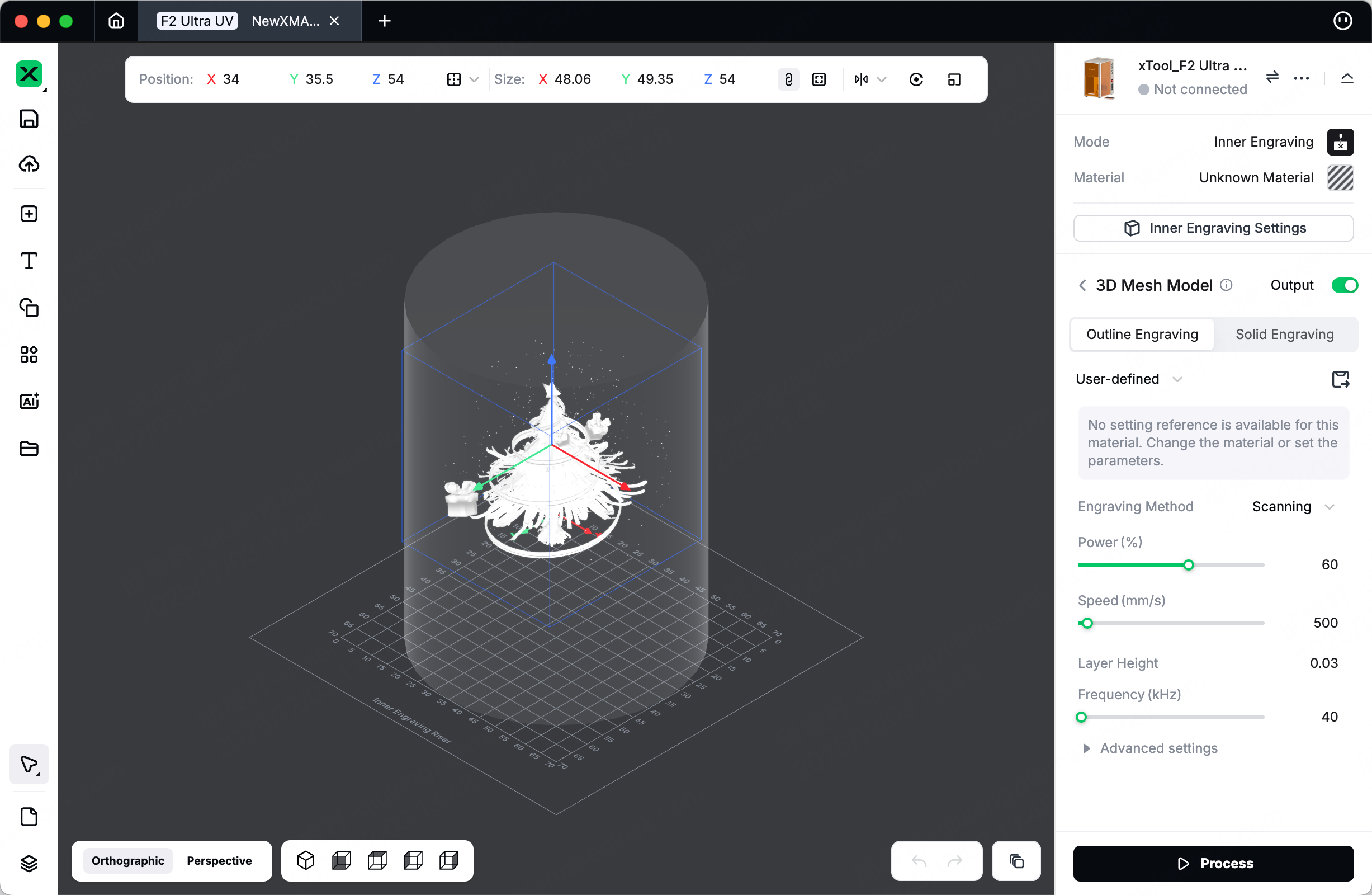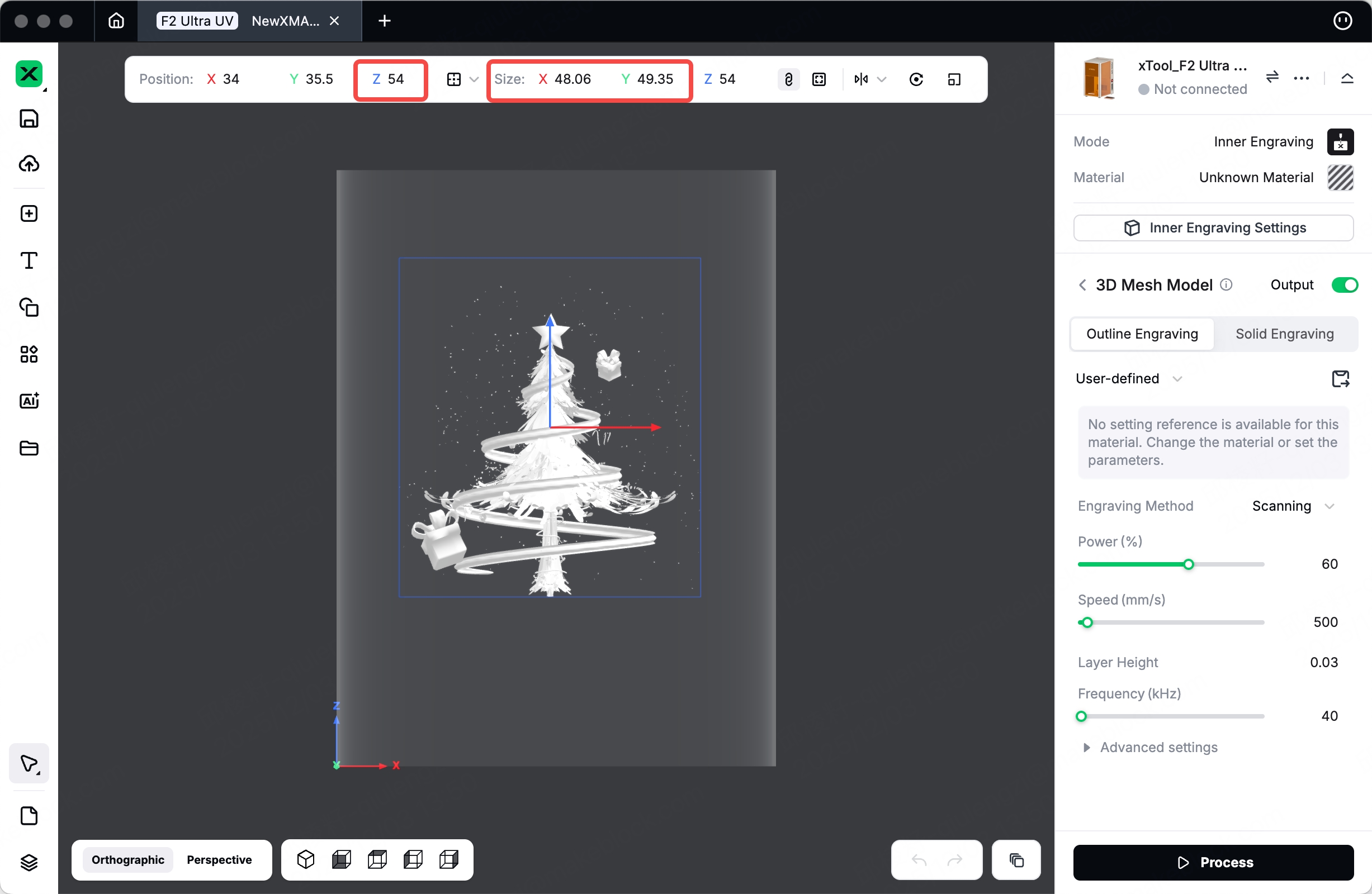 📌 Due to the refraction of the sphere, the engraved object will be magnified. Therefore, when setting the size of the object, it needs to be slightly smaller than the diameter of the sphere. For example, the sphere I use has a diameter of 70mm, and the size of the engraved object is set to 50mm.