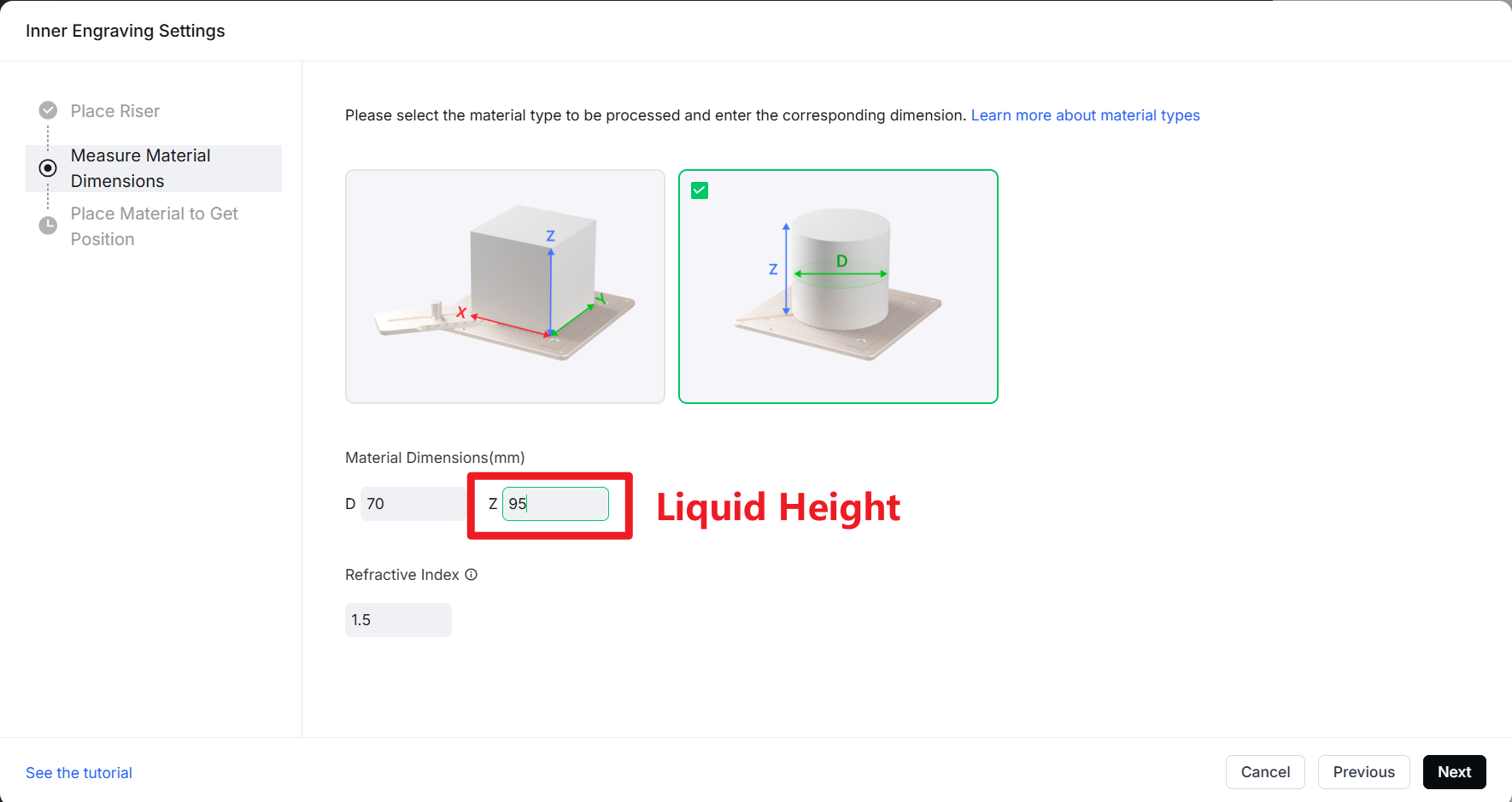 Enter the inner engraving settings, change the object to a cylinder, input the sphere diameter in the D diameter field, and input the measured liquid height in the Z height field (this is very important; the liquid level height determines the refraction incident height, which will affect the quality and position of the inner engraving).