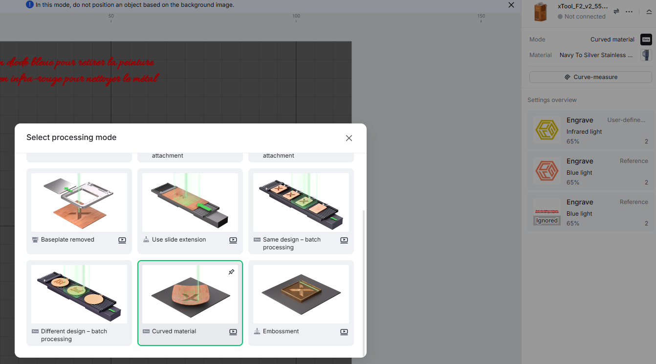 Place your tumbler and using your F2, choose curved material from the processing mode menu and follow instructions