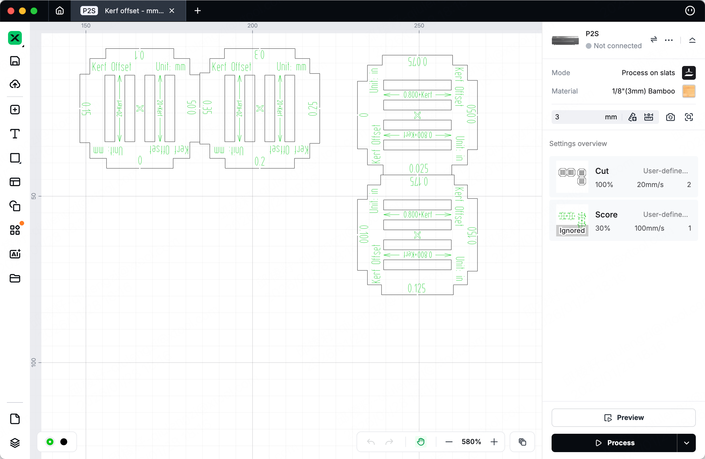 The laser beam has width and burns away material during cutting. Without Kerf, joints will be loose. Download the test file to determine the optimal value. (Default recommended: 0.2mm)